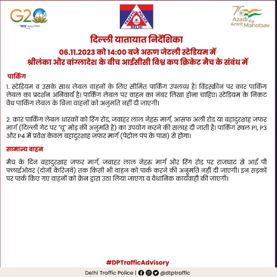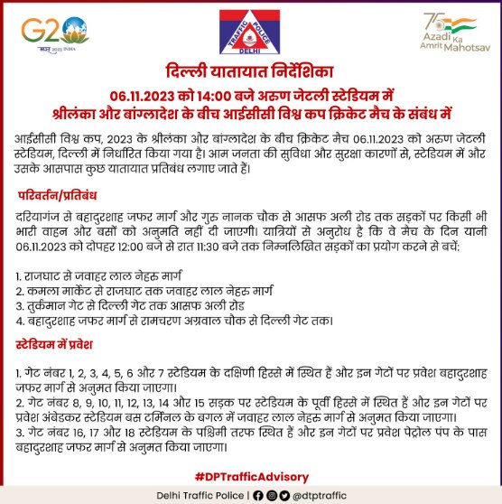 दिल्ली के अरुण जेटली स्टेडियम में आज, 6 नवंबर को वर्ल्ड कप का श्रीलंका और बांग्लादेश का मैच होने वाला है. यह मैच दोपहर 2 बजे से खेला जाएगा और ये दिल्ली में वर्ल्ड कप का आखिरी मैच है. इसलिए इस मैच को देखने वालों की तादाद ज्यादा हो सकती है. वहीं, त्योहारी सीजन के चलते शॉपिंग का दौर भी जारी है, जो सड़कों पर भीड़ बढ़ा रही है. जिसके चलते ट्रैफिक पुलिस ने स्थिति को सामान्य बनाए रखने की कोशिश में ट्रैफिक एडवाइजरी जारी की है.