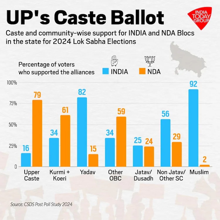 इंडिया ब्लॉक के कुर्मी-कोइरी और गैर-यादव ओबीसी वोट 2019 की तुलना में छह और 13 प्रतिशत बढ़ गए. लोकसभा में समाजवादी पार्टी की 37 जीतों में से 21 ओबीसी (पांच यादव सहित), सात दलित, चार मुस्लिम और पांच अगड़ी जाति के उम्मीदवारों ने जीती हैं.