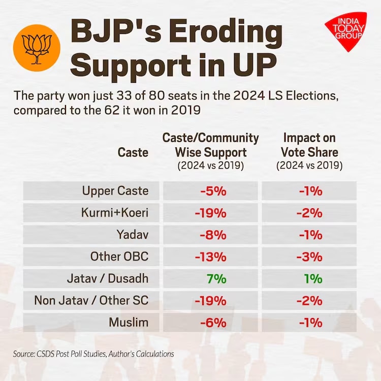 इसका मुख्य कारण गैर-यादव ओबीसी और गैर-जाटव दलितों के समर्थन में कमी आना रहा. सीएसडीएस के चुनाव बाद सर्वेक्षण के आंकड़ों से पता चलता है कि भाजपा को कुर्मी-कोइरी से 61 प्रतिशत समर्थन (19 प्रतिशत का नुकसान), गैर-यादव ओबीसी से 59 प्रतिशत समर्थन (13 प्रतिशत का नुकसान) और गैर-जाटव दलितों से 29 प्रतिशत समर्थन (19 प्रतिशत का नुकसान) मिला.