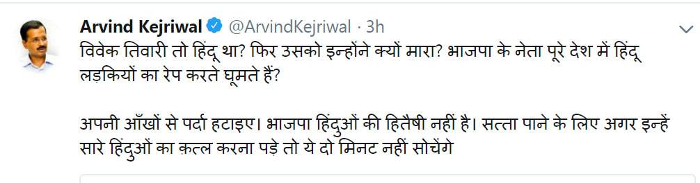 केजरीवाल ने ट्वीट किया कि विवेक को आखिर क्यों मारा? केजरीवाल ने कहा कि बीजेपी नेता पूरे देश में हिंदू लड़कियों का रेप करते घूमते हैं. वो हिंदुओं के हितैषी नहीं हैं. अगर सत्ता पाने के लिए इन्हें सभी हिंदुओं का कत्ल भी करना पड़े तो ये दो मिनट नहीं सोचेंगे.