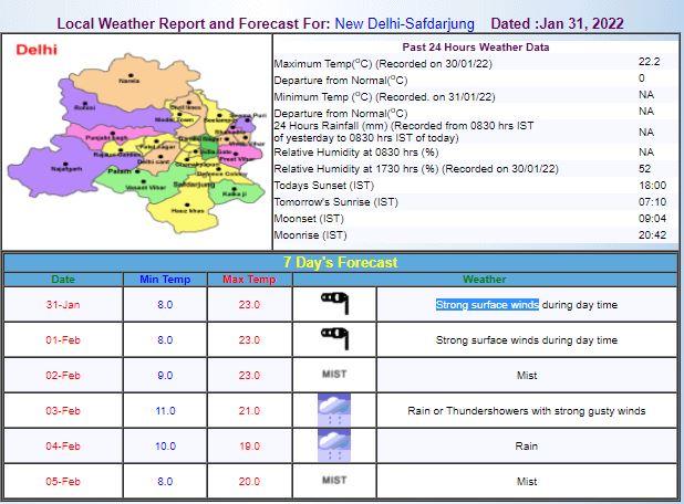 मौसम विभाग (IMD) के अनुसार, आज (सोमवार) यानी 31 जनवरी को दिन में धूप खिलेगी और आसमान साफ रहेगा. हालांकि, हवाएं और तेज गति से चल सकती हैं. वहीं, अधिकतम तापमान 23 और न्यूनतम तापमान 8 डिग्री तक सिमट सकता है. 2 फरवरी तक दिल्ली का अधिकतम तापमान 23 डिग्री और न्यूनतम तापमान 8 से 11 डिग्री के आसपास बना रहेगा.