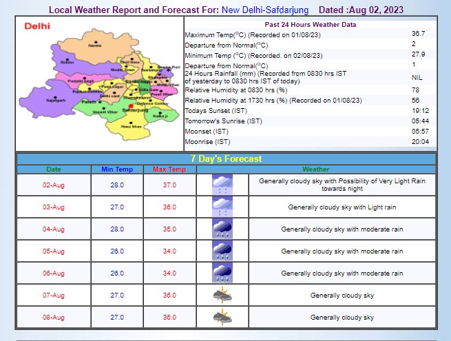 मौसम विभाग के मुताबिक, आज यानी 2 अगस्त को दिल्ली में आमतौर पर आसमान में बादल छाए रहेंगे और रात में बहुत हल्की बारिश की संभावना है. लेकिन आज दिन का तापमान कल के मुकाबले ज्यादा रह सकता है यानी बारिश की शुरुआत से पहले आज दिल्लीवालों को गर्मी झेलनी पड़ सकती है. आईएमडी के मुताबिक, बुधवार को न्यूनतम और अधिकतम तापमान क्रमश: 28 डिग्री सेल्सियस और 37 डिग्री सेल्सियस के आसपास रहने की संभावना है.