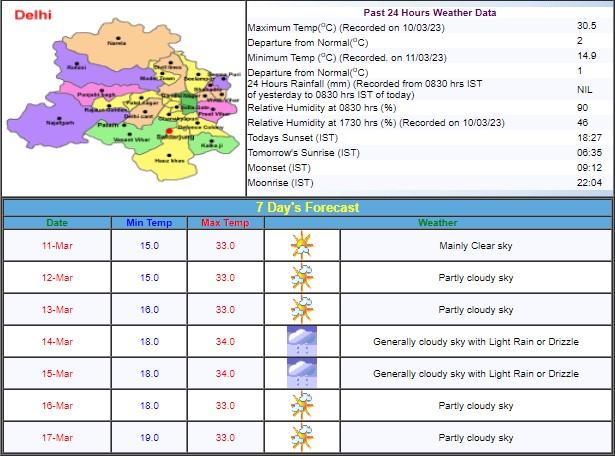 मौसम विभाग के अनुसार दिल्ली में 11,12,13 मार्च तक आसमान में बादल छाए नजर आएंगे. इस दौरान हल्की बूंदाबांदी देखी जा सकती है. हालांकि, इस दौरान तेज बारिश की संभावना नहीं है. न्यूनतम तापमान 15 डिग्री, वहीं अधिकतम तापमान 33 डिग्री के आसपास रह सकता है. वहीं, 14 और 15 मार्च को राजधानी में तेज गरज के साथ हल्की मध्यम बारिश के आसार हैं. इस दौरान न्यूनतम तापमान 18 डिग्री और अधिकतम तापमान 34 डिग्री दर्ज किया जा सकता है. देश की राजधानी के अलावा 24 घंटों के दौरान, झारखंड, ओडिशा, पश्चिम बंगाल, दक्षिण तमिलनाडु और केरल में हल्की बारिश हो सकती है.