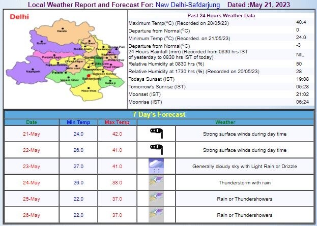 मौसम विभाग के अनुसार, अभी दो दिन गर्म हवाओं और हीट वेव का कहर देखने को मिलेगा. वहीं, 24 से 26 मई तक राष्ट्रीय राजधानी दिल्ली में एक बार फिर बारिश होने की उम्मीद है. जिससे तापमान में गिरावट आएगी और गर्मी से मामूली राहत मिलेगी. इस दौरान अधिकतम तापमान 37-38 डिग्री सेल्सियस रह सकता है.