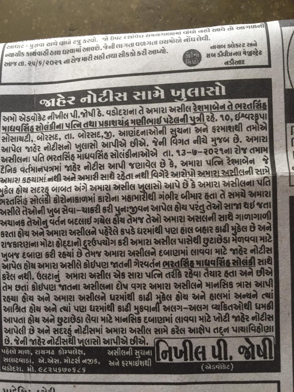 मंगलवार को भरत सिंह सोलंकी ने अखबार में एक विज्ञापन देते हुए कहा था, "मेरी पत्नी रेशमा पटेल पिछले 4 सालों से मेरे साथ नहीं रह रही है और मेरी बातों को सुनती नहीं है. मेरी पत्नी के साथ मेरे नाम से किसी भी तरह का पैसों का लेन-देन न करें और अगर करते हैं तो उसके लिए भरत सिंह सोलंकी जिम्मेदार नहीं होंगे."