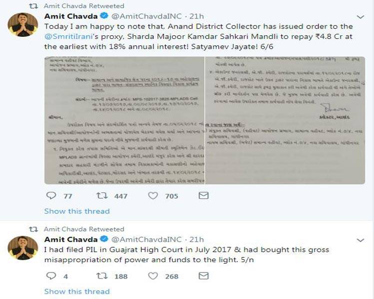 इस संबंध में अपने अंतिम ट्वीट में अमित चावड़ा ने मामले में कार्रवाई का जिक्र किया. चावड़ा ने ट्वीट में लिखा, 'आज मैं बहुत खुश हूं कि आणंद जिला कलेक्टर ने स्मृति ईरानी के प्रतिनिधि शारदा माजूर कामदार सहकारी मंडली को 4.8 करोड़ रुपये 18% ब्याज की दर से जमा कराने का आदेश जारी किया है.' चावड़ा ने गुजराती भाषा में लिखा एक पत्र भी ट्वीट के साथ शेयर किया है.