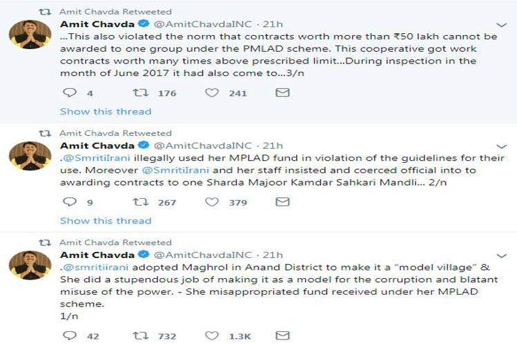 अमित चावड़ा ने एक और ट्वीट में स्मृति ईरानी पर अपनी सांसद निधि के दुरुपयोग का भी आरोप लगाया है. गुजरात से राज्यसभा सांसद स्मृति ईरानी पर चावड़ा ने आरोप लगाया, 'स्मृति ईरानी और उनके स्टाफ ने शारदा मजूर कामदार सहकारी मंडली को ठेका देने के लिए अधिकारी को मजबूर किया.'