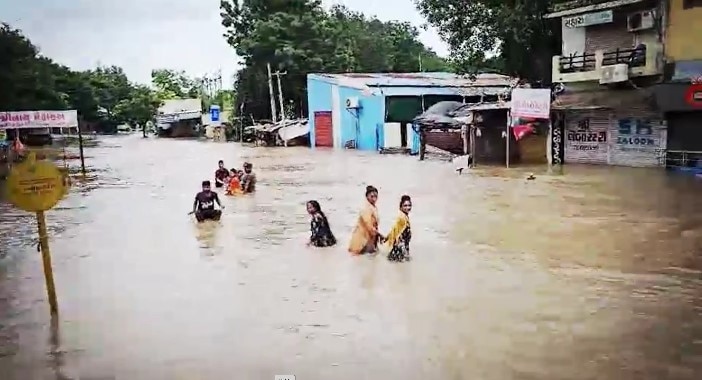 गुजरात के वडोदरा, कच्छ और खेड़ा इलाके में मूसलाधार बारिश से ऐसी स्थिति उत्पन्न हो गई है कि लोगों की सांसें अटक रही हैं. पूरा शहर पानी में समा चुका है. पूरी की पूरी मार्केट डूब चुकी है. सड़कों पर सैलाब ही सैलाब है.