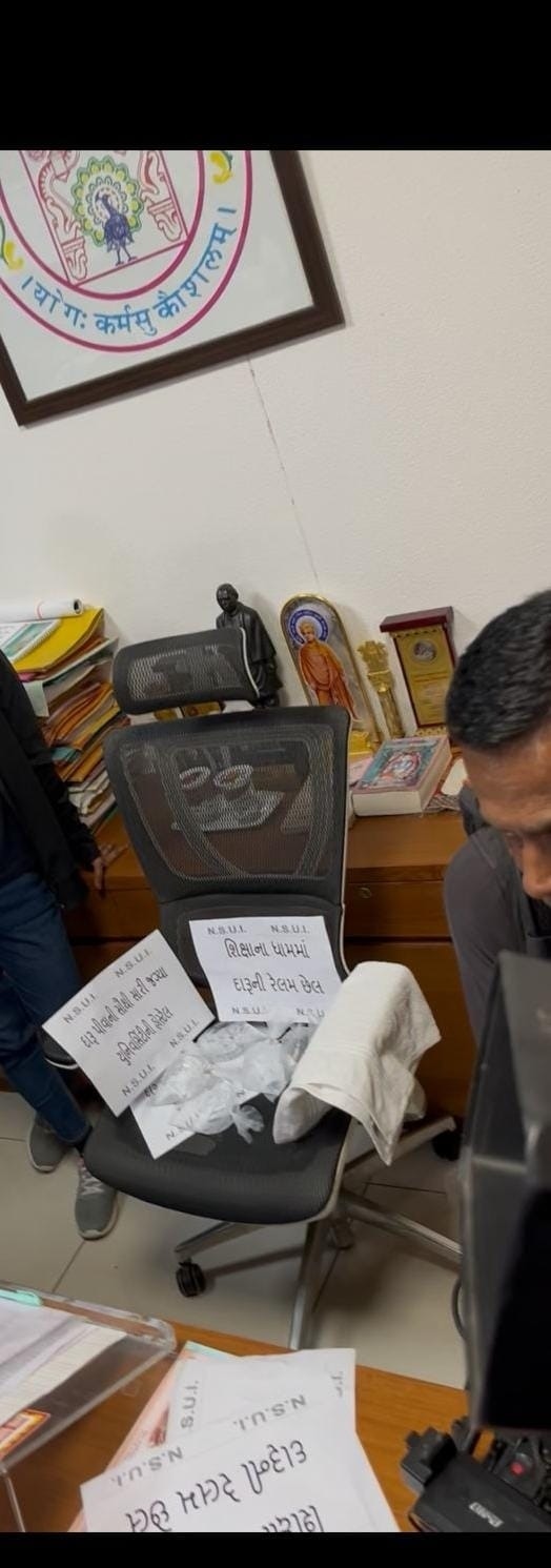 गुजरात यूनिवर्सिटी के हॉस्टल की छत पर से शराब की खाली बोतलें मिलने के बाद बिल्डिंग के आसपास की खाली जगहों पर भी जांच की गई. इनकी छतों से भी कई शराब की खाली बोतलें पाई गईं. NSUI कार्यकर्ताओं ने इसका वीडियो भी सोशल मीडिया पर वायरल कर दिया है. NSUI कार्यकर्ताओं ने यूनिवर्सिटी के रजिस्ट्रार की चेयर पर शराब की बोतल मिलने के पोस्टर तक लगा दिए.