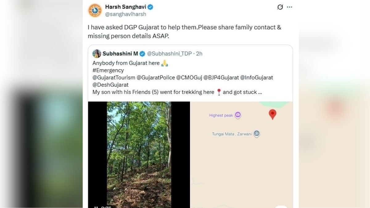 गुजरात में नर्मदा जिले में ट्रेकिंग करने गए पांच सॉफ्टवेयर इंजीनियर्स जंगलों में भटक गए. चार घंटे से ज्यादा समय जंगल ने भटकने के बाद एक युवक ने अपनी मां को कॉल कर पूरी बात बताई.उनकी मां ने तेलंगाना से ट्वीट किया जिसके बाद राज्य के गृह मंत्री हर्ष संघवी ने तुरंत पुलिस की मदद से युवक को जंगल से बाहर निकाला.