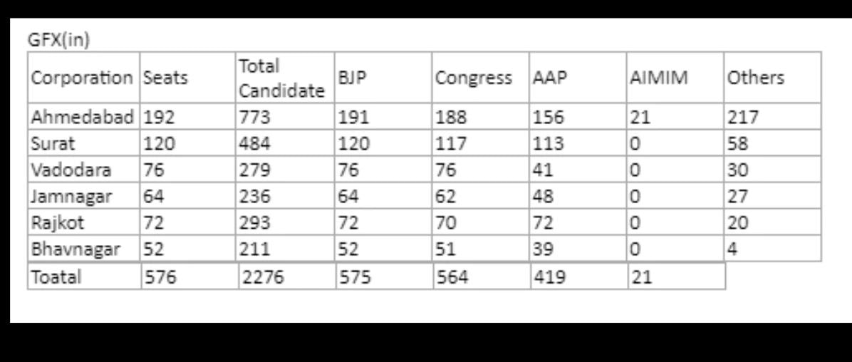 गुजरात की 6 नगर निगमों की कुल 575 सीटों के नतीजे आज आएंगे. भाजपा और कांग्रेस ने इस चुनाव को आगामी विधानसभा चुनावों को देखते इतना अधिक महत्व दिया है कि खुद गृहमंत्री अमित शाह भी अपने पूरे परिवार के साथ वोट डालने के लिए पहुंचे थे. वैसे ये जंग इस बार कांग्रेस और भाजपा के बीच ही नहीं है, बल्कि इस बार आम आदमी पार्टी और AIMIM भी इन बड़ी पार्टियों का गणित बिगाड़ सकती हैं.