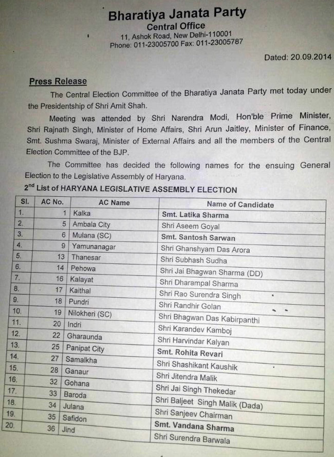 बीजेपी ने हरियाणा चुनाव के मद्देनजर उम्मीदवारों की दूसरी लिस्ट जारी कर दी है. इस लिस्ट में पार्टी ने 47 विधानसभा क्षेत्रों के उम्मीदवारों के नाम जारी किए हैं. शनिवार को प्रधानमंत्री नरेंद्र मोदी की उपस्थिति में बीजेपी की केंद्रीय चुनाव की समिति की बैठक में उम्मीदवारों के नाम पर मुहर लगाई गई. शनिवार को जारी हुए उम्मीदवारों की लिस्ट में विदेश मंत्री सुषमा स्वराज की बहन वंदना शर्मा का भी नाम है.