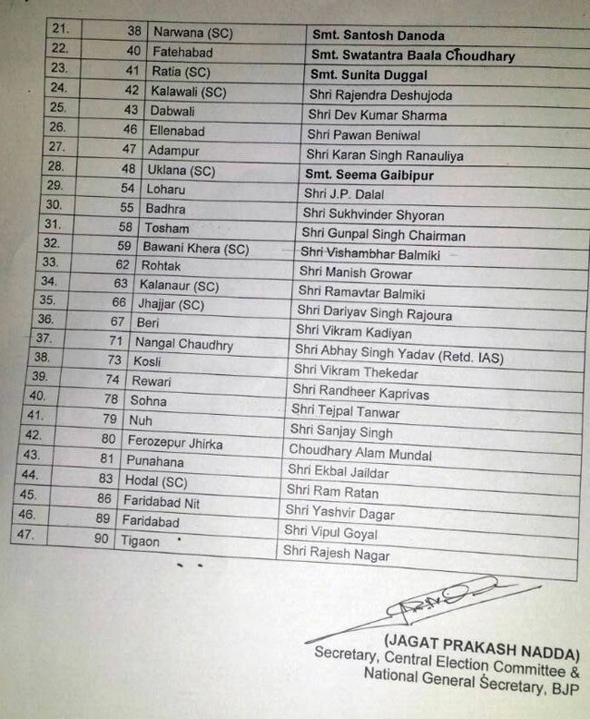 90 सदस्यीय हरियाणा विधानसभा के 43 उम्मीदवारों की घोषणा 9 सितंबर को पहले ही की जा चुकी थी. शनिवार को जारी उम्मीदवारों की सूची इस प्रकार है.