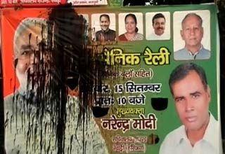 रेवाड़ी में नरेंद्र मोदी की रैली के लिए भव्य इंतजाम हैं. लेकिन कुछ लोग हैं जो मोदी के विरोध में भी खड़े हैं. ऐसे ही मोदी के कुछ विरोधियों ने रेवाड़ी में लगे उनके पोस्टरों पर कालिख पोत दी. पुलिस ने इस मामले में अज्ञात लोगों के खिलाफ केस दर्ज किया है. बीजेपी ने इसे कांग्रेस की हरकत बताया है.