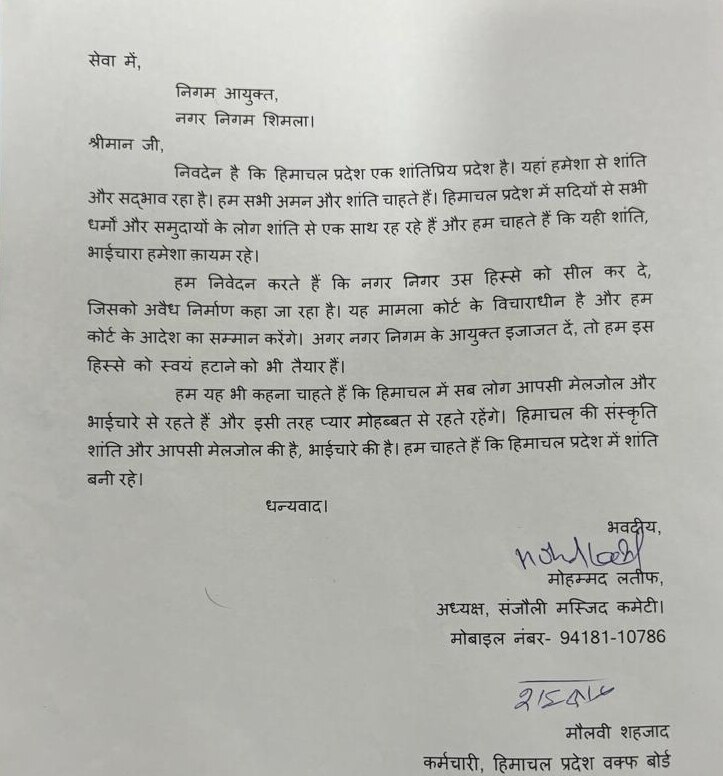 समिति के एक प्रतिनिधिमंडल ने नगर निगम आयुक्त भूपेंद्र अत्री को ज्ञापन देकर यह अनुरोध किया और कहा कि इलाके में रहने वाले मुसलमान हिमाचल प्रदेश के स्थायी निवासी हैं और यह सद्भाव और भाईचारे को बनाए रखने के लिए यह कदम उठाया जा रहा है. कल्याण समिति के सदस्य मुफ्ती मोहम्मद शफी कासमी ने कहा, "हमने संजौली में स्थित मस्जिद के अनधिकृत हिस्से को ध्वस्त करने के लिए शिमला नगर निगम आयुक्त से अनुमति मांगी है."