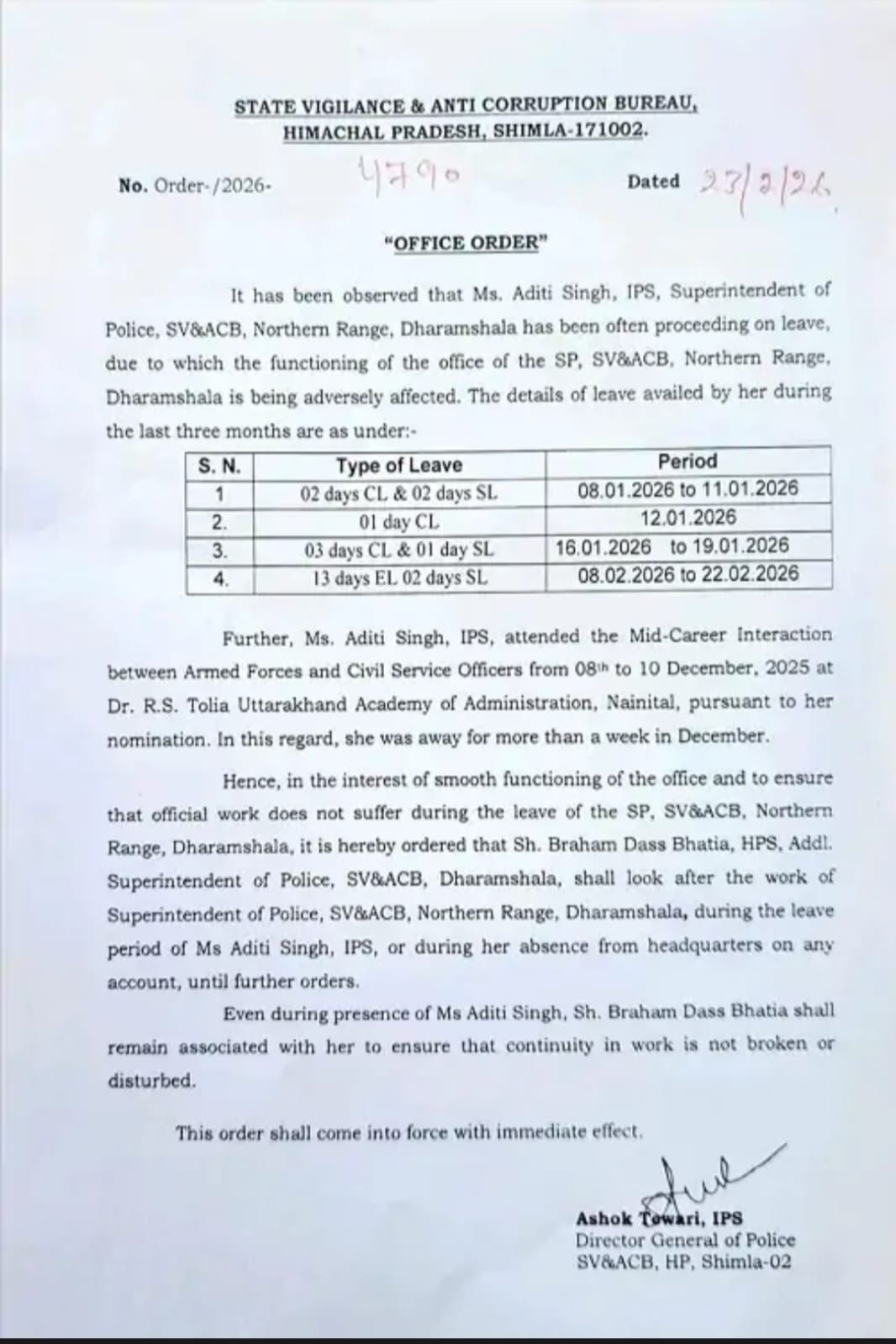 हिमाचल प्रदेश पुलिस महकमे में इन दिनों एक प्रशासनिक आदेश चर्चा का विषय बना हुआ है. मामला 2021 बैच की आईपीएस अधिकारी अदिति सिंह से जुड़ा है, जिनके बार-बार छुट्टी पर रहने के कारण उनका चार्ज एक जूनियर अधिकारी को सौंप दिया गया है.