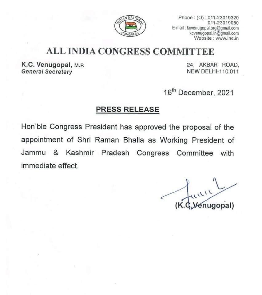 जम्मू-कश्मीर कांग्रेस में चल रहे सियासी घमासान के बीच कांग्रेस नेता और पूर्व मंत्री रमन भल्ला को प्रदेश कांग्रेस का कार्यकारी अध्यक्ष नियुक्त किया गया है. इसे जम्मू क्षेत्र में कांग्रेस पार्टी द्वारा एक बड़े हिंदू आउटरीच के रूप में देखा जा रहा है. वहीं गुलाम अहमद मीर जम्मू-कश्मीर कांग्रेस के अध्यक्ष बने रहेंगे. हालांकि पिछले काफी वक़्त से गुलाम अहमद मीर को लेकर भी बगावती सुर छेड़े जा रहे हैं.