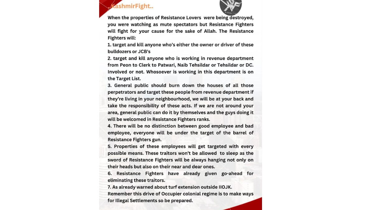 JK में अतिक्रमण अभियान को लेकर आतंकी संगठन की धमकी, कहा- अफसरों को टारगेट करेंगे