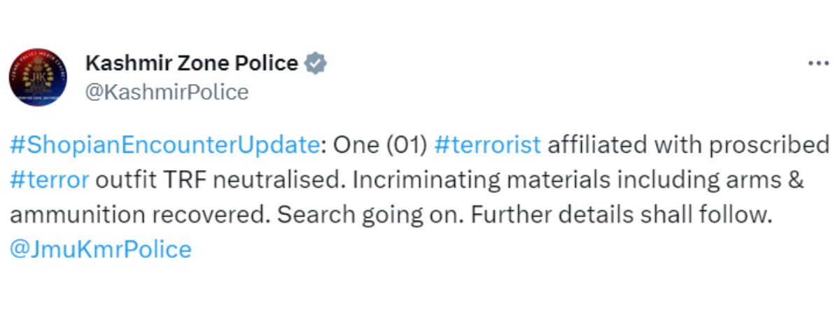 कश्मीर के शोपियां में बुधवार देर रात सुरक्षाबलों और दहशतगर्दों के बीच मुठभेड़ हो गई. जानकारी के मुताबिक काफी देर तक चले एनकाउंटर में सुरक्षाबलों ने एक आतंकी को मार गिराया है. दहशतगर्द प्रतिबंधित आतंकी संगठन TRF का मेंबर बताया जा रहा है. जम्मू-कश्मीर पुलिस ने बताया कि आतंकी के पास से भारी मात्रा में हथियार और गोला बारूद बरामद किया गया है.