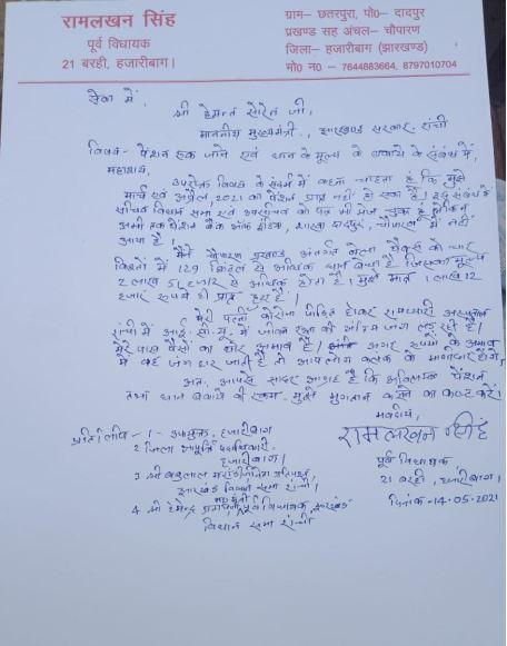 झारखंड के बरही (हजारीबाग) के पूर्व विधायक रहे रामलखन सिंह ने झारखंड के मुख्यमंत्री हेमंत सोरेन से गुहार लगाते हुए पत्र लिखा है, जिसमें उन्होंने लगभग 2 महीने से पेंशन और पैक्स में बेचे गए धान की बकाया राशि भी न मिलने की शिकायत की है. दरअसल पूर्व विधायक की पत्नी कोरोना पॉज़िटिव हैं और 12 मई से रांची के राम प्यारी अस्पताल में इलाज करवा रही हैं. पूर्व विधायक रामलखन सिंह ने ट्वीट करते हुए कहा कि अगर ये बकाया पैसे उन्हें मिल जाएं तो उनके इलाज में सहूलियत हो जाएगी.