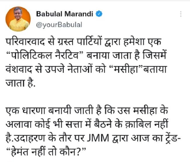 बीजेपी नेता बाबूलाल मरांडी ने ट्वीट कर कहा है कि परिवारवाद से ग्रस्त पार्टियां हमेशा एक पॉलिटिकल नैरेटिव सेट करने की कोशिश करती हैं. वंशवाद से उपजे नेताओं को मसीहा बताया जाता है. उन्होंने आगे कहा कि एक धारणा ये भी बनाई जाती है कि उस मसीहा के अलावा कोई भी सत्ता में बैठने के काबिल नहीं है. बाबूलाल मरांडी ने 'हेमंत नहीं तो कौन?' को इसी का उदाहरण बताया.