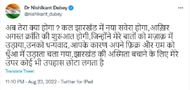 उन्होंने अंत में ये भी लिखा है कि जिन्होंने मेरी बातों को मजाक में उड़ाया, उनको धन्यवाद. निशिकांत दुबे ने कहा है कि आपके कारण अपनी फिक्र और गम को धुएं में उड़ाता चला गया. झारखंड की अस्मिता बचाने के लिए मेरे ऊपर कोई भी उपहास छोटा लगता है. बीजेपी सांसद निशिकांत दुबे ने इससे पहले भी एक ट्वीट किया था.
