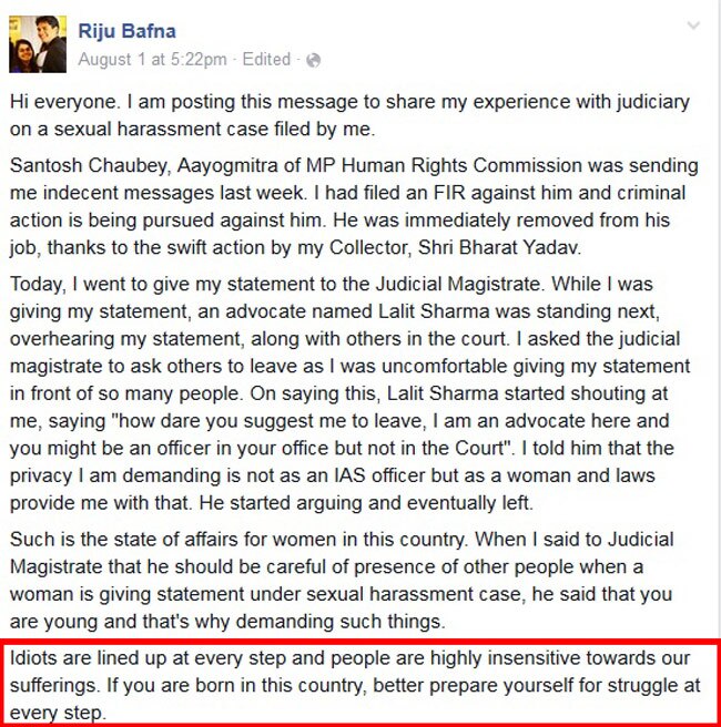यौन उत्पीड़न की शिकार IAS अफसर रिजू बाफना ने फेसबुक पोस्ट के जरिए अपनी आपबीती सुनाई है और यौन अपराध के मामलों की सुनवाई पर ज्यूडिशियल सिस्टम पर सवाल खड़े किए हैं. मध्य प्रदेश के सिवनी में पोस्टेड बाफना ने बताया है कि अश्लील मैसेज देने के लिए उन्होंने राज्य के मानवाधिकार आयोग के एक अफसर के खिलाफ एफआआईआर भी दर्ज कराई है.