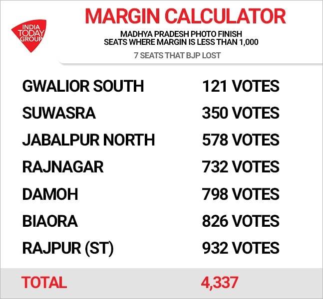 चुनाव आयोग की ओर से उपलब्ध कराए गए मतगणना के आखिरी आंकड़ों के मुताबिक मध्य प्रदेश की 10 सीटों पर फोटो-फिनिश की स्थिति रही, जहां जीत का अंतर 1,000 वोट से भी कम रहा.