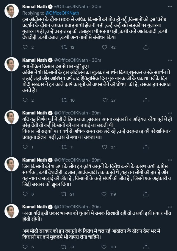एमपी के पूर्व मुख्यमंत्री और कांग्रेस नेता कमलनाथ ने भी कृषि कानून निरस्त होने पर बधाई दी, लेकिन ये भी कहा कि अगर ये कदम पहले ही उठा लिया जाता तो कइयों की जान बचाई जा सकती थी. कमलनाथ ने कई ट्वीट कर केंद्र को भी घेरा और किसानों को बधाई धी. उन्होंने कहा कि इन कानूनों को रद्द करवाने के लिए किसान एक साल से डटे हुए थे. उन्हें कई प्रताड़नाओं से गुजरना पड़ा. उन्हें देशद्रोही, आतंकवादी जैसे नामों से भी बुलाया गया, मगर किसान टस से मस नहीं हुए.