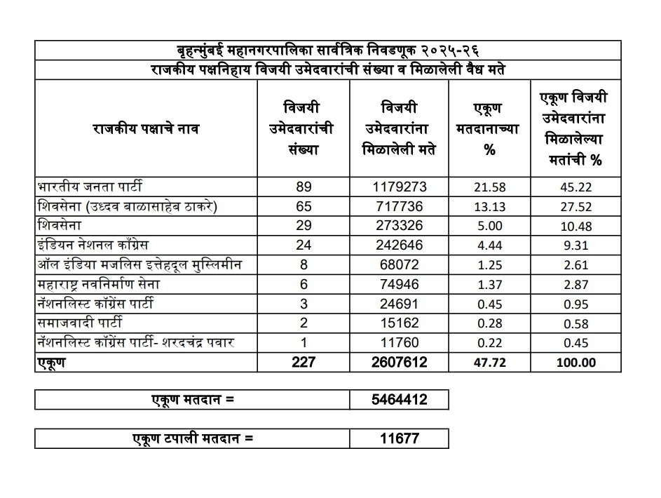 - देर रात बीएमसी चुनाव के फाइनल नतीजे आए. महायुति ने कुल 118 सीटें जीती हैं, जो BMC में बहुमत के आंकड़े से चार सीटें ज़्यादा हैं. BJP BMC में सरकार बनाने के लिए शिवसेना शिंदे गुट के साथ गठबंधन करेगी.
