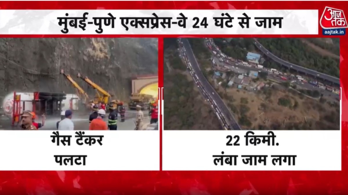 मुंबई-पुणे एक्सप्रेसवे पर 24 घंटे से ज्यादा समय बीत जाने के बाद भी ट्रैफिक जाम की स्थिति गंभीर बनी हुई है. खंडाला घाट के आडोशी सुरंग के पास मंगलवार शाम करीब 5 बजे केमिकल से भरा एक गैस टैंकर मुंबई की तरफ जाने वाली लेन में पलट गया था. हादसे के बाद टैंकर से गैस रिसाव शुरू हो गया, जिससे पूरे इलाके में खतरे की स्थिति बन गई.