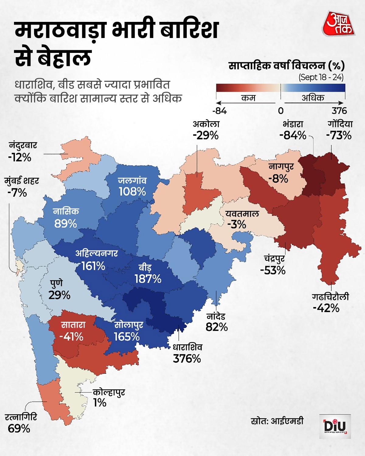 18 से 24 सितंबर के बीच राज्यभर में बारिश का पैटर्न गड़बड़ रहा. पुणे, रत्नागिरी, रायगढ़ और ठाणे में सामान्य से ज्यादा बारिश हुई, जबकि सतारा और सांगली में कम बारिश रिकॉर्ड हुई. मराठवाड़ा के जिलों जैसे धाराशिव, बीड, जालना और हिंगोली में सामान्य से कई गुना ज्यादा बारिश दर्ज की गई.