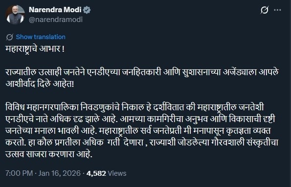 पीएम मोदी ने निकाय चुनाव में बीजेपी गठबंधन की बंपर जीत पर बधाई दी. उन्होंने सोशल मीडिया प्लेटफॉर्म एक्स पर पोस्ट में लिखा, "धन्यवाद, महाराष्ट्र! राज्य के उत्साही लोगों ने NDA के जन कल्याण और सुशासन के एजेंडे को आशीर्वाद दिया है. विभिन्न नगर निगम चुनावों के नतीजे दिखाते हैं कि NDA और महाराष्ट्र के लोगों के बीच रिश्ता और भी मज़बूत हो गया है. हमारे काम का अनुभव और विकास का विज़न लोगों के दिलों को छू गया है. मैं महाराष्ट्र के सभी लोगों का दिल से आभार व्यक्त करता हू्ं. यह जनादेश प्रगति को और गति देगा और यह राज्य से जुड़ी गौरवशाली संस्कृति का उत्सव है."