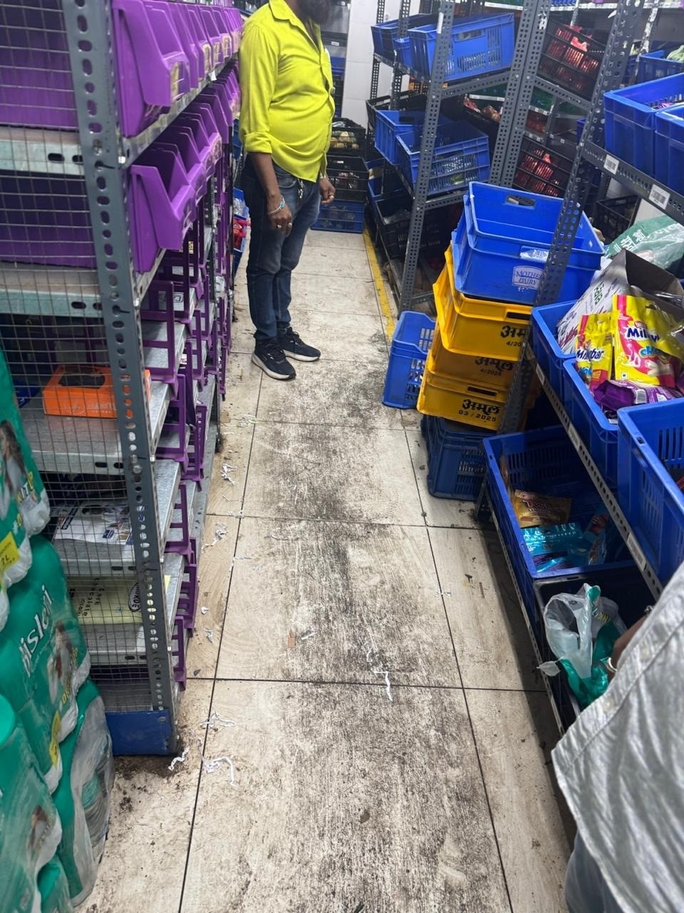 -खाद्य पदार्थों का अव्यवस्थित भंडारण, कुछ को सीधे गीले और गंदे फर्श पर रखा गया.