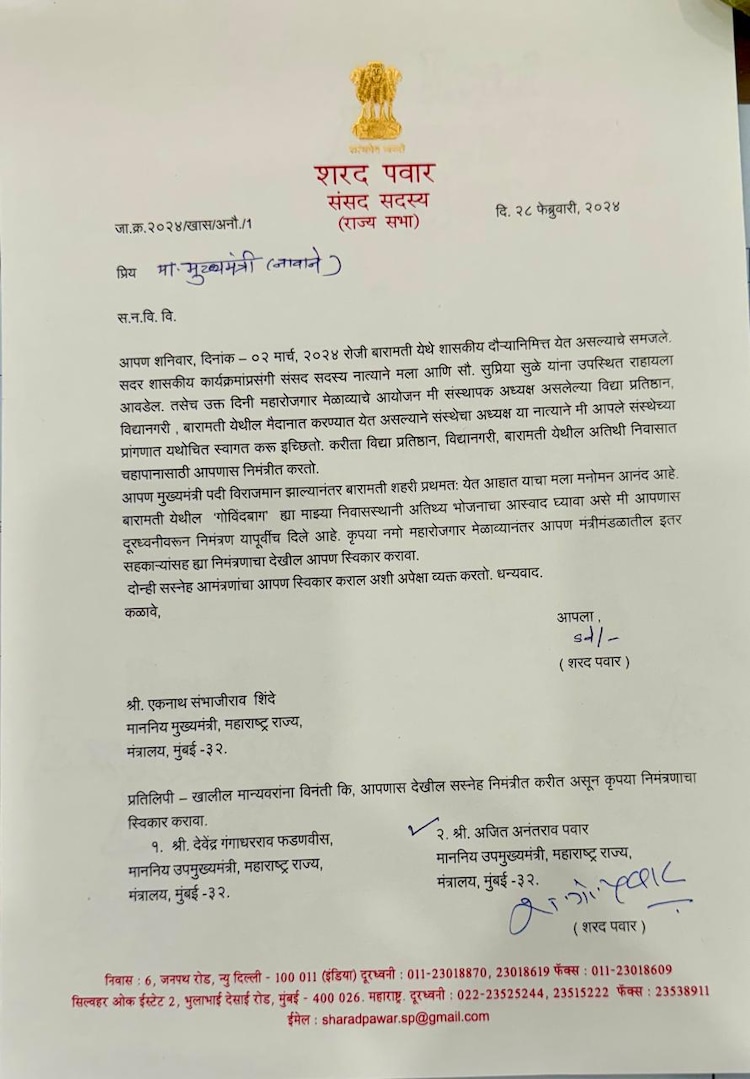 मुख्यमंत्री एकनाथ शिंदे, डिप्टी सीएम देवेंद्र फडणवीस और अजित पवार को संबोधित पत्र में शरद पवार ने कहा कि राज्य के मुख्यमंत्री के रूप में शपथ लेने के बाद सीएम शिंदे पहली बार बारामती आ रहे हैं और मैं इसे लेकर बहुत खुश हूं. मैं कार्यक्रम के बाद उन्हें और उनके कैबिनेट सहयोगियों को अपने आवास पर भोजन के लिए निमंत्रण देना चाहूंगा.