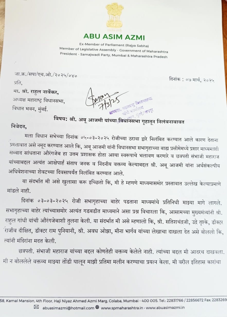 विधानसभा अध्यक्ष को लिखे पत्र में अबू ने कहा, "उन्होंने छत्रपति शिवाजी महाराज के खिलाफ कोई बयान नहीं दिया. बल्कि, उनके बयान को मीडिया द्वारा तोड़-मरोड़कर पेश किया गया.