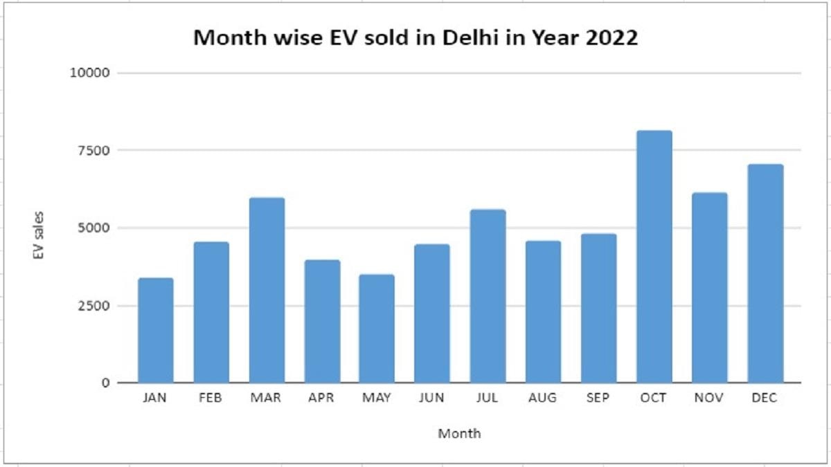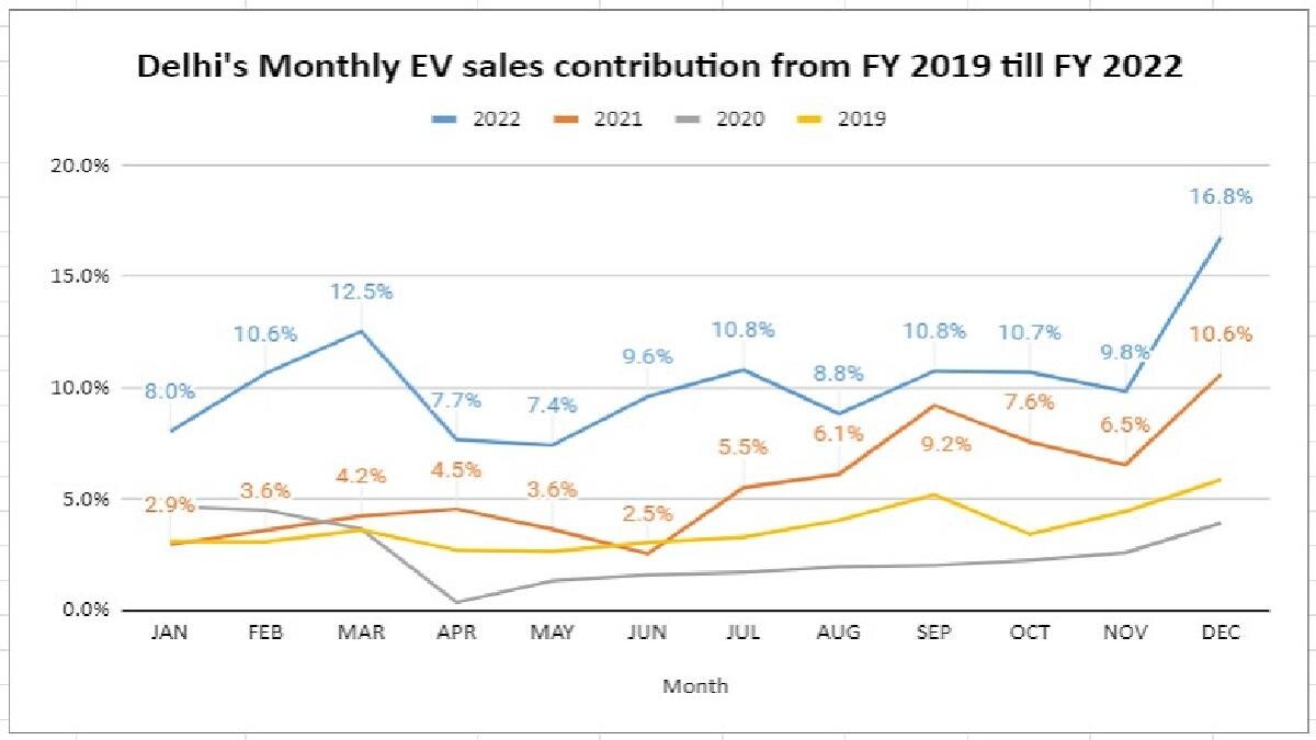 दिसंबर 2022 में दिल्ली में बिके कुल वाहनों में इलेक्ट्रिक वाहन (ईवी) बिक्री का योगदान 16.8% रहा. यह भारत में किसी भी राज्य द्वारा अब तक का सबसे अधिक मासिक ईवी योगदान है.अगर हाइब्रिड-पेट्रोल वाहनों की बिक्री को शामिल किया जाए, तो महीने में योगदान बढ़कर 20.5% हो जाएगा. दिसंबर में, दिल्ली ने 86% की सालाना वृद्धि के साथ 7,046 इलेक्ट्रिक वाहन पंजीकृत किए.