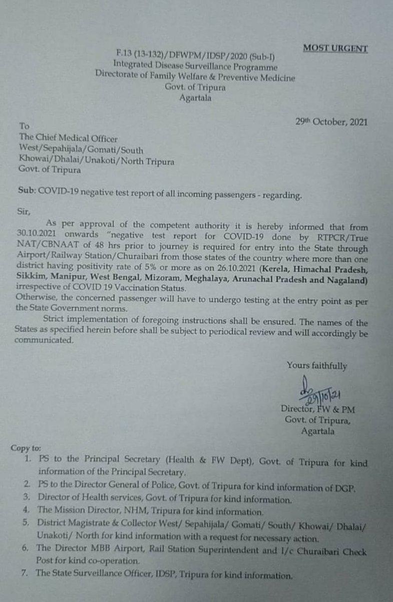 पूर्वोत्तर के त्रिपुरा में भी कोरोना के मामले बढ़ने लगे हैं. कोरोना के बढ़ते मामलों को देख त्रिपुरा सरकार ने कड़ा फैसला लिया है. त्रिपुरा में प्रवेश के लिए अब कोरोना टेस्ट की आरटी-पीसीआर रिपोर्ट होना जरूरी है. आरटी-पीसीआर रिपोर्ट निगेटिव रहने पर ही दूसरे प्रदेश से आने वाले लोगों को त्रिपुरा में एंट्री दी जाएगी.