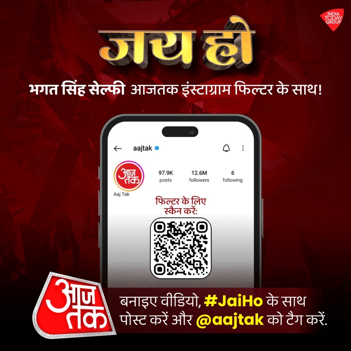 इसके लिए तैयार हुआ है भगत सिंह का AR फिल्टर. इसका इस्तेमाल आप दिए गए QR कोड पर स्कैन करके कर सकते हैं. इस फिल्टर के साथ बनाई गई वीडियो को आप #जयहो हैशटैग के साथ शेयर करें और @aajtak को टैग भी कीजिए.