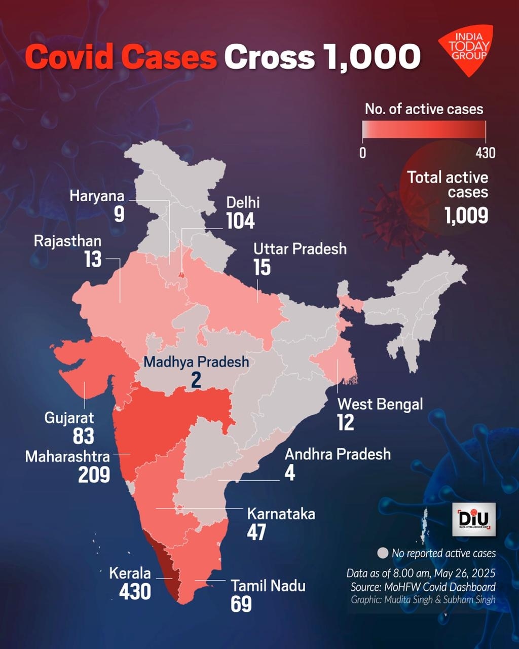 स्वास्थ्य विभाग के अनुसार, सबसे ज्यादा मामले केरल में 430 में है, उसके बाद महाराष्ट्र में 209 और दिल्ली 104 एक्टिव केसों के साथ तीसरे स्थान है. जबकि कर्नाटक में 34 नए मामले सामने आए हैं. इसके साथ ही राज्य में एक्टिव मामलों की संख्या 47 हो गई है. स्वास्थ्य विभाग ने आगे बताया कि गुजरात में 76 नए मामले सामने आए हैं, अब राज्य में एक्टिव मामलों की संख्या 83 हो गई है. तो हरियाणा में 8 नए मामले सामने आए हैं. इसके साथ ही राज्य में एक्टिव केसों की संख्या 9 हो गई है. तो राजस्थान में 11 नए केस सामने आए हैं.