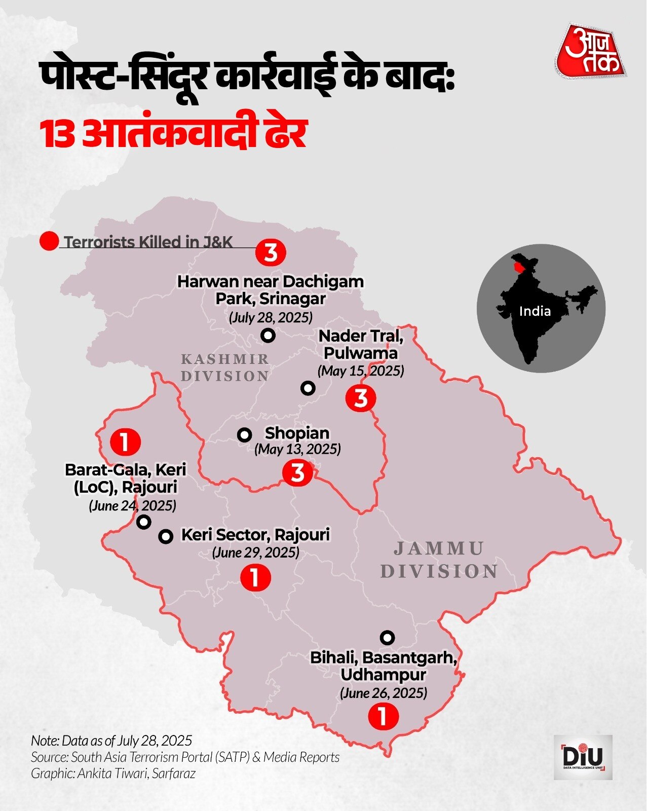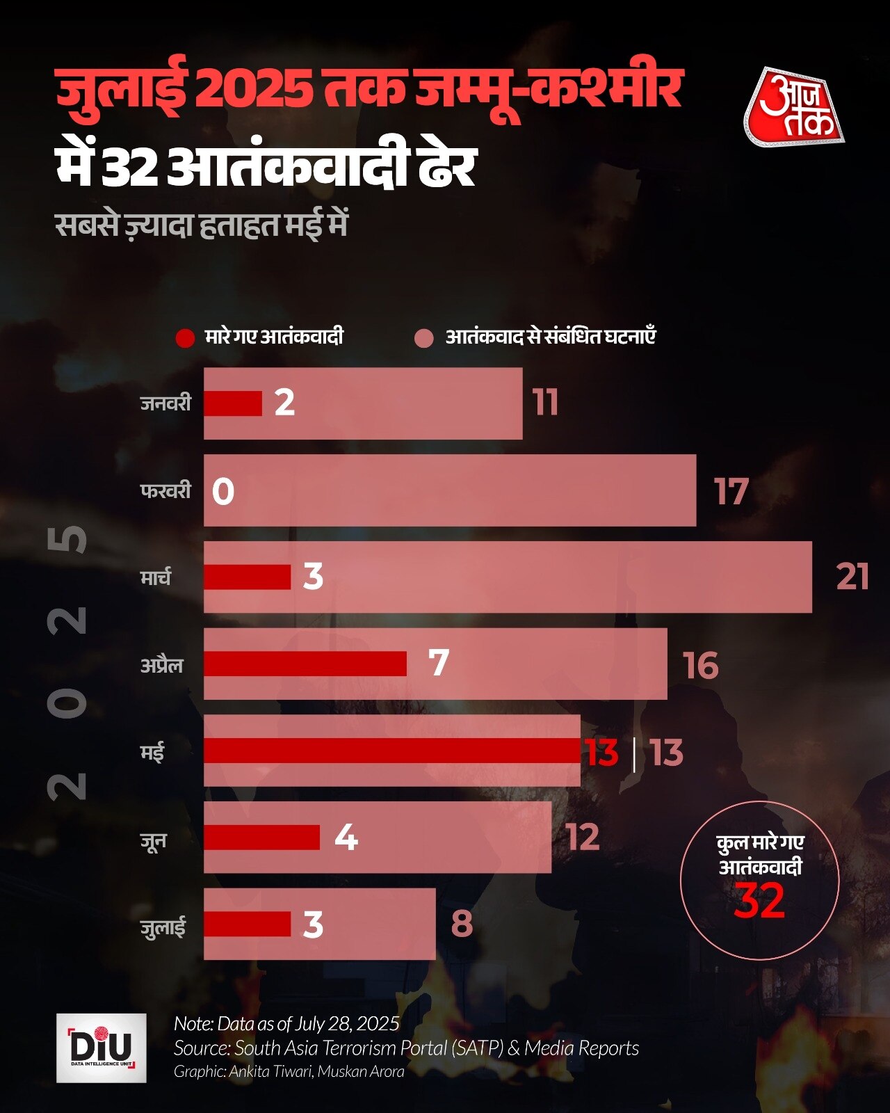 मार्च में आतंकी घटनाएं बढ़कर 21 हो गईं जो इस साल का सबसे ज्यादा आंकड़ा था. अप्रैल में 16 घटनाएं हुईं. मई सबसे ज्यादा तनावपूर्ण महीना रहा जिसमें 13 अलग-अलग घटनाओं में 13 आतंकी मारे गए. इस दौरान ऑपरेशन सिंदूर, ऑपरेशन केलर और ऑपरेशन नादेर जैसे अभियानों ने सीमा पार आतंक को रोकने में बड़ी भूमिका निभाई.