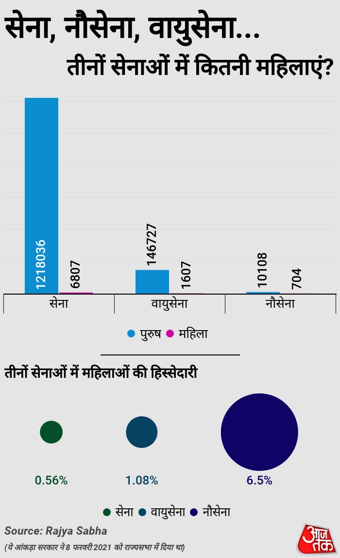 - तीनों सेनाओं में कितनी महिलाएं हैं? इसका अभी का कोई ताजा आंकड़ा नहीं है. पिछले साल 8 फरवरी को राज्यसभा में रक्षा राज्य मंत्री श्रीपाद नाईक ने तीनों सेनाओं में महिलाओं की हिस्सेदारी का आंकड़ा दिया था.