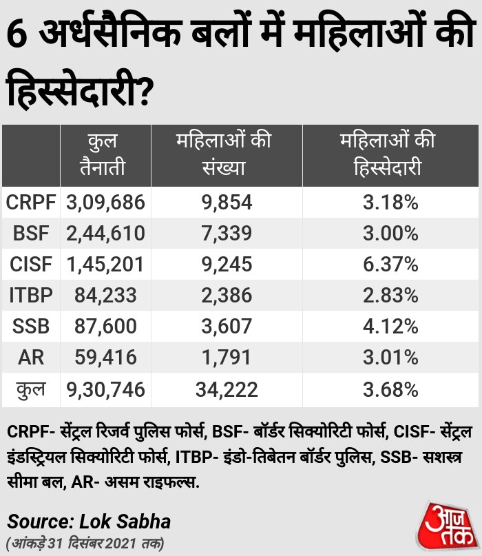 - लोकसभा में सरकार ने बताया था कि 31 दिसंबर 2021 तक अर्ध सैनिक बलों में 10 लाख से ज्यादा पद थे, जिनमें से 9.30 लाख पद भरे हुए थे. इनमें से महज 34 हजार 222 ही महिलाएं थीं.