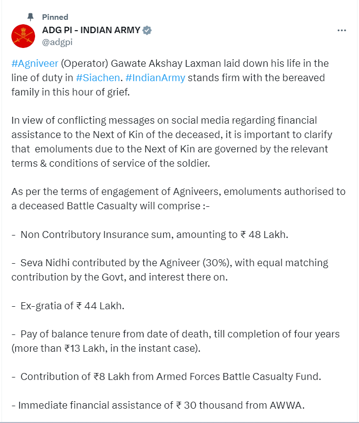 शहीद के परिजनों को मिलने वाले मुआवजे को लेकर आर्मी ने पोस्ट करते हुए एक्स पर लिखा, 'अग्निवीर (ऑपरेटर) गावते अक्षय लक्ष्मण ने सियाचिन में कर्तव्य निभाते हुए अपने प्राण न्यौछावर कर दिए. दुःख की इस घड़ी में भारतीय सेना शोक संतप्त परिवार के साथ मजबूती से खड़ी है. मृतक के परिजनों को वित्तीय सहायता के संबंध में सोशल मीडिया पर परस्पर विरोधी संदेशों को देखते हुए, यह स्पष्ट करना महत्वपूर्ण है कि परिजनों को मिलने वाली परिलब्धियां (धनराशि) सैनिक की सेवा के प्रासंगिक नियमों और शर्तों द्वारा शासित होती हैं.' अग्निवीरों की नियुक्ति की शर्तों के अनुसार, शहीद के लिए अधिकृत परिलब्धियां इस प्रकार होंगी:-