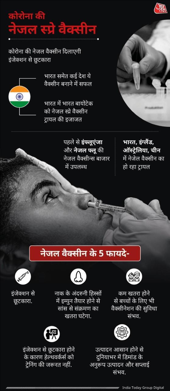 नेजल स्प्रे वैक्सीन को इंजेक्शन की बजाय नाक से दिया जाता है. यह नाक के अंदरुनी हिस्सों में इम्युन तैयार करती है. इसे ज्यादा कारगर इसलिए भी माना जाता है क्योंकि कोरोना समेत हवा से फैलने वाली अधिकांश बीमारियों के संक्रमण का रूट प्रमुख रूप से नाक ही होता है और उसके अंदरूनी हिस्सों में इम्युनिटी तैयार होने से ऐसे बीमारियों को रोकने में ज्यादा असरदार साबित होती है.