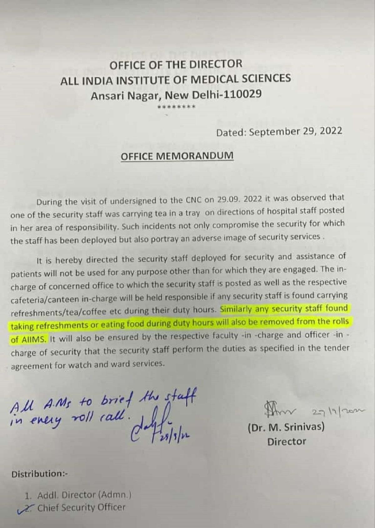ऑल इंडिया इंस्टीट्यूट्स ऑफ मेडिकल साइंसेज (एम्स) के नए निदेशक डॉ. एम श्रीनिवास ने नियुक्ति के कुछ दिनों के भीतर ही नया फरमान जारी किया है. उन्होंने सर्कुलर जारी कर सिक्योरिटी गार्ड्स से चाय या अन्य सामान मंगवाने पर रोक लगाने के निर्देश दिए हैं.