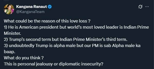राष्ट्रपति डोनाल्ड ट्रंप के ताजा बयानों से कंगना रनौत नाराज हो गई थीं और कहा था, "इस प्रेम हानि का कारण क्या हो सकता है? वह अमेरिका के राष्ट्रपति हैं लेकिन सबसे चहीते नेता भारतीय प्रधानमंत्री मोदी हैं. ट्रंप का दूसरा कार्यकाल है, लेकिन भारतीय प्रधानमंत्री का तीसरा टर्म है. इसमें कोई दो राय नहीं है कि ट्रंप एक अल्फा पुरुष हैं, लेकिन हमारे पीएम एक सब-अल्फा पुरुषों के बाप हैं." इसके साथ ही उन्होंने पूछा था, "यह व्यक्तिगत जलन है या कूटनीतिक असुरक्षा?"