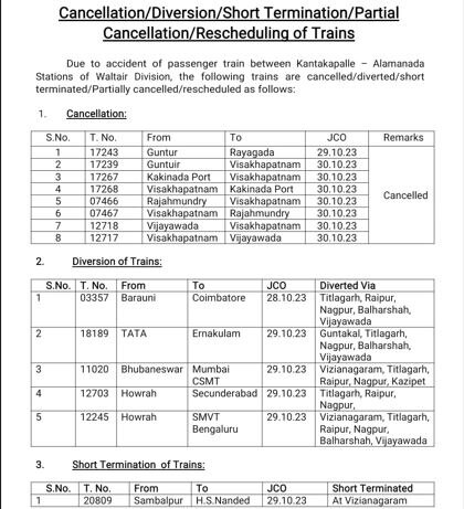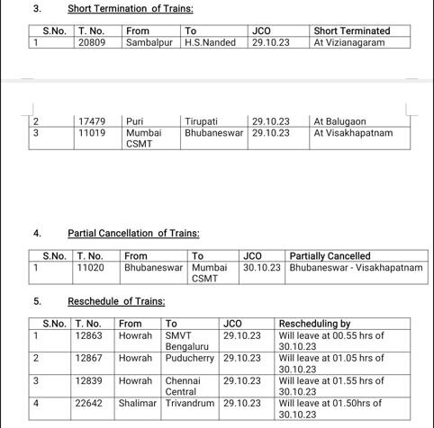 इसके अलावा कोरबा-विशाखापत्तनम, पारादीप-विशाखापत्तनम, रायगड़ा-विशाखापत्तनम, पलासा-विशाखापत्तनम, विशाखापत्तनम-गुनुपुर, गुनुपुर-विशाखापत्तनम, विजयनगरम-विशाखापत्तनम ट्रेनों को भी रद्द कर दिया गया है.