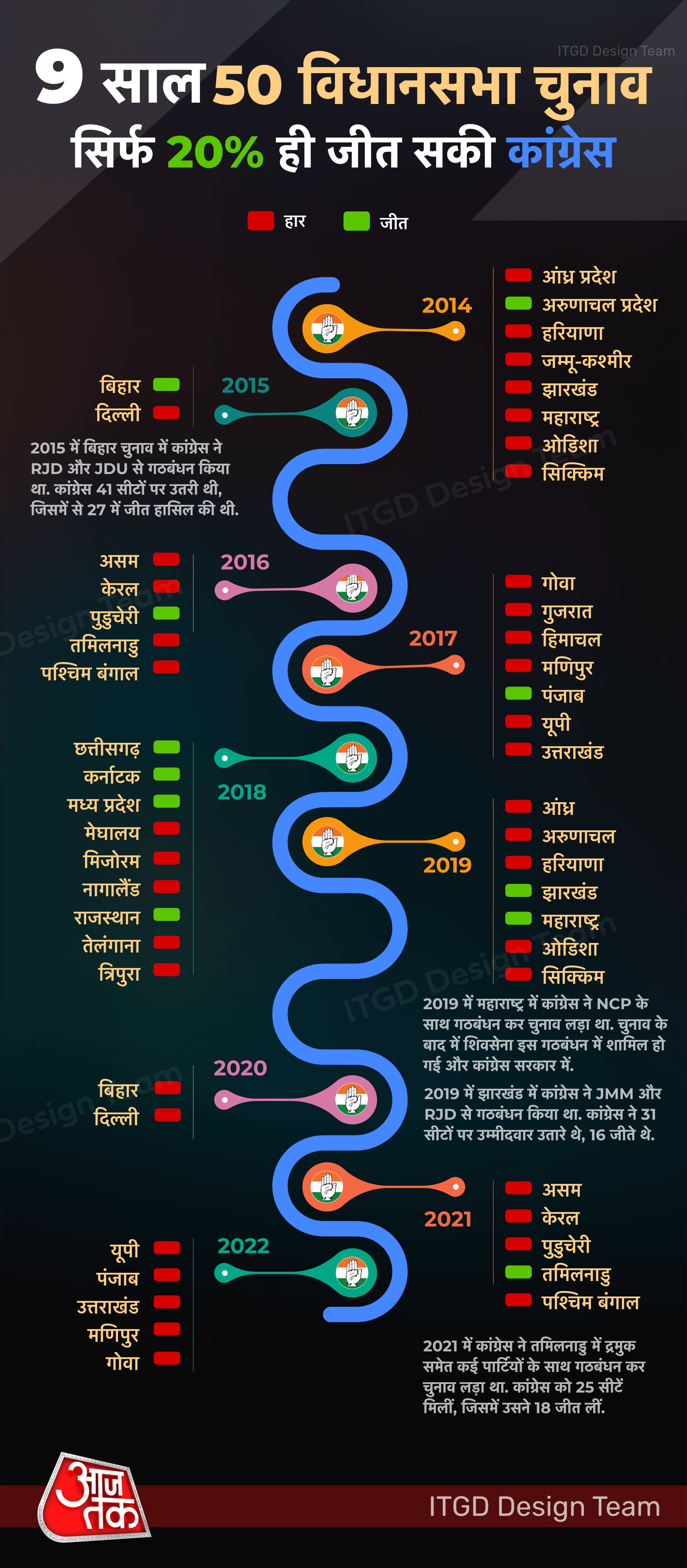 वैसे 2014 के लोकसभा चुनाव के बाद से ही कांग्रेस का ग्राफ गिर रहा है. 2014 के लोकसभा चुनाव में कांग्रेस महज 44 सीटें जीत पाई थी. उसके बाद से अब तक 9 साल में 50 विधानसभा चुनाव हो चुके हैं. इनमें 11 राज्यों में कांग्रेस जीती भी, लेकिन कई राज्यों में बगावत के चलते पार्टी को सत्ता गंवानी भी पड़ी.