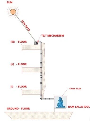 रामनवमी के मौके पर रामलला का सूर्यतिलक का नजारा बहुत अद्भुत होगा. सूर्य की रोशनी मंदिर की तीसरी मंजिल पर लगे पहले दर्पण पर पड़ेगी. यहां से परावर्तित होकर पीतल के पाइप में प्रवेश करेगी. पीतल के पाइप में लगे दूसरे दर्पण से टकराकर 90 डिग्री पर पुनः परावर्तित हो जाएंगी. फिर पीतल की पाइप से जाते हुए यह किरण तीन अलग-अलग लेंस से होकर गुजरेगी और लंबे पाइप के गर्भगृह वाले सिरे पर लगे शीशे से टकराएगी. गर्भगृह में लगे शीशे से टकराने के बाद किरणें सीधे रामलला के मस्तिष्क पर 75 मिलीमीटर का गोलाकार तिलक लगाएंगी और लगातार पांच मिनट तक प्रकाशमान होंगी.